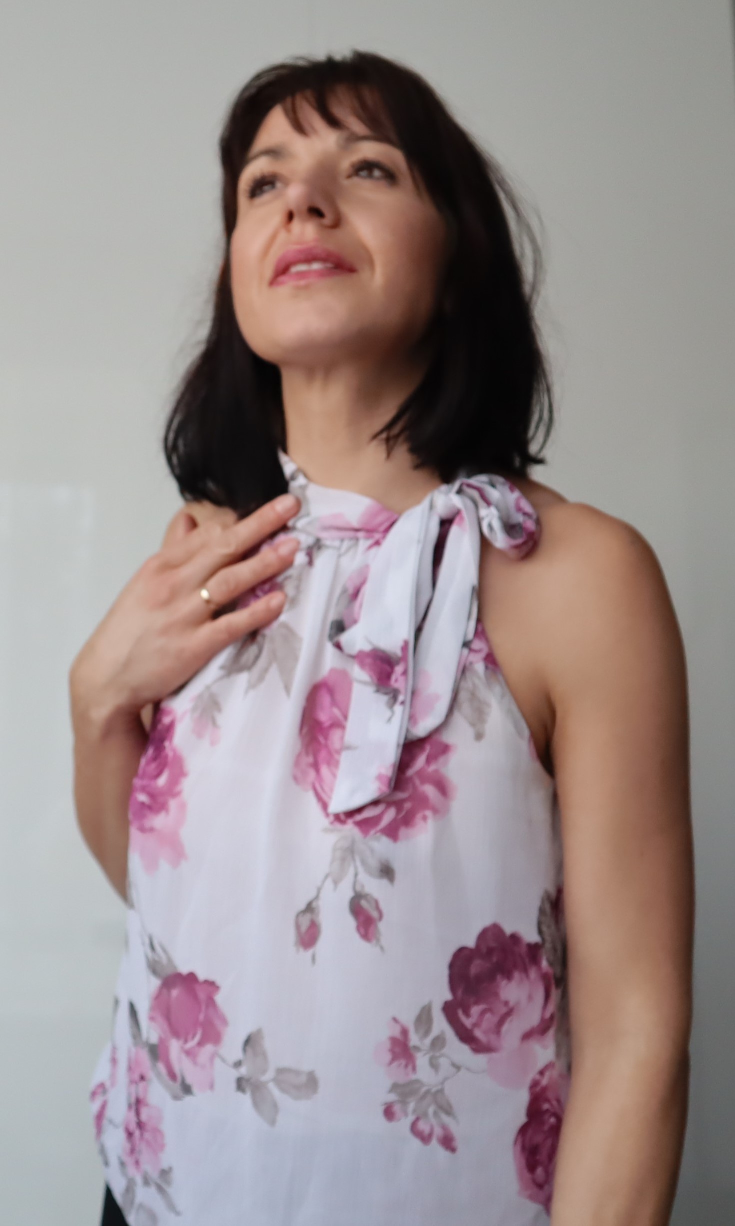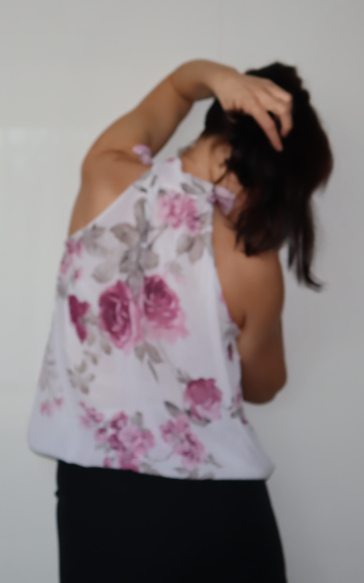 Delikatna bluzeczka z kwiatowym wzorem. Wiązana na szyi, z prawej strony. Krój luźny, na dole ściągacz.