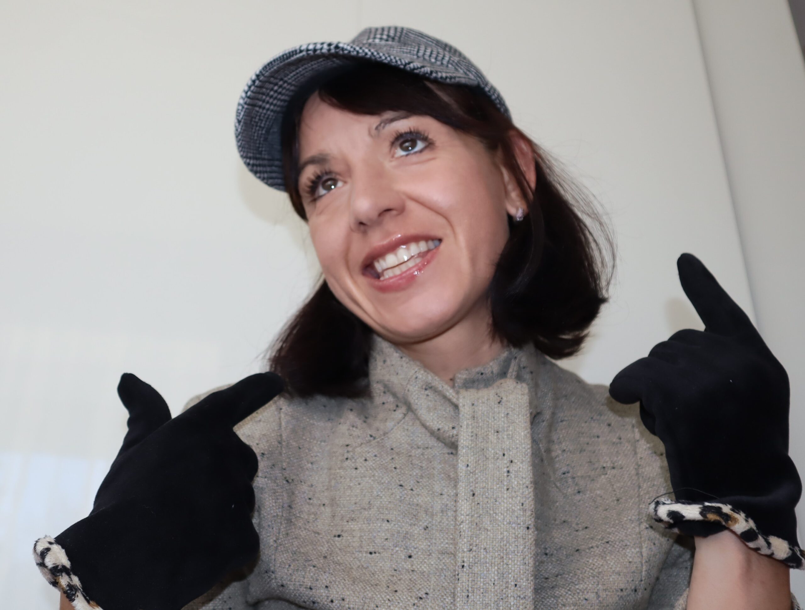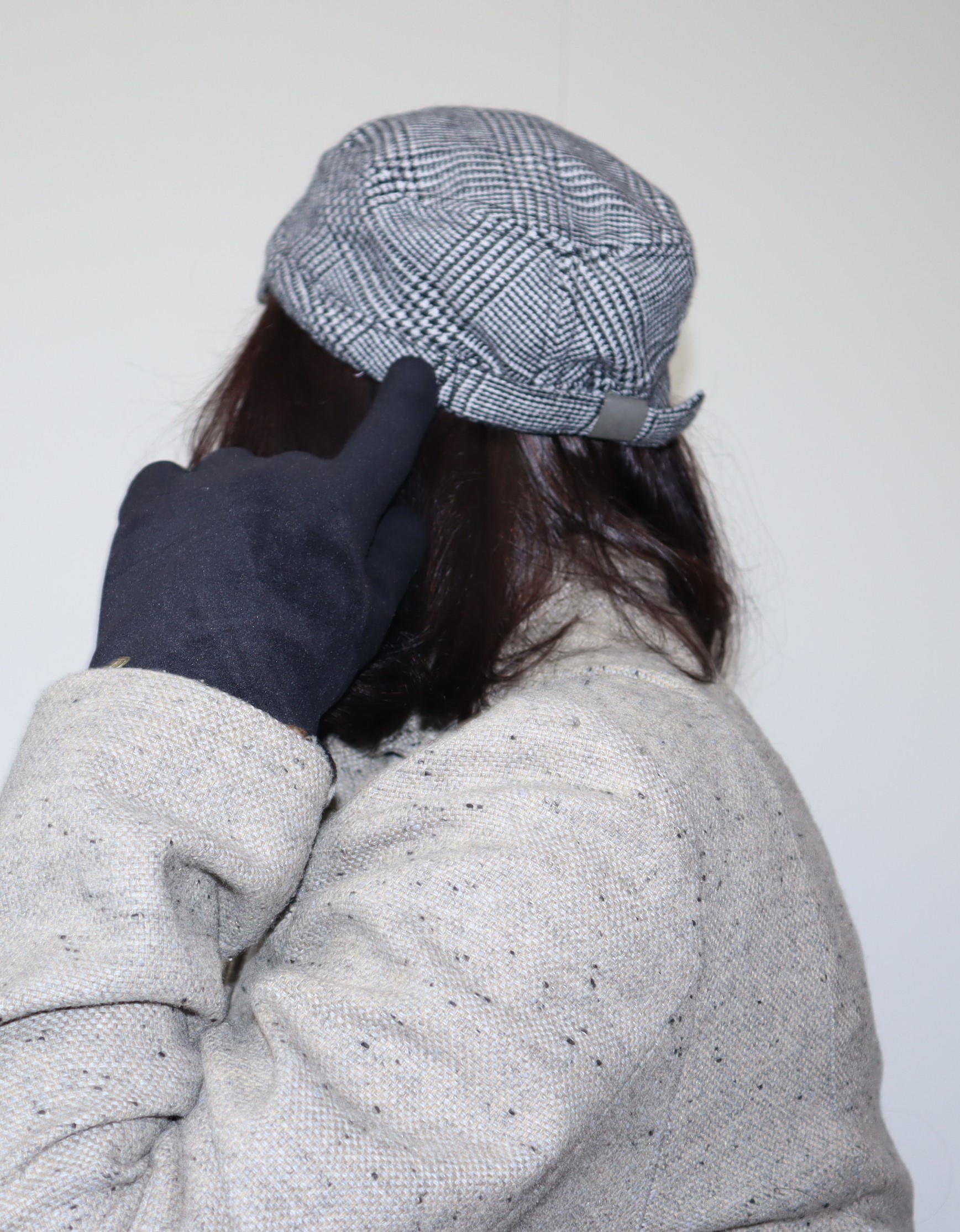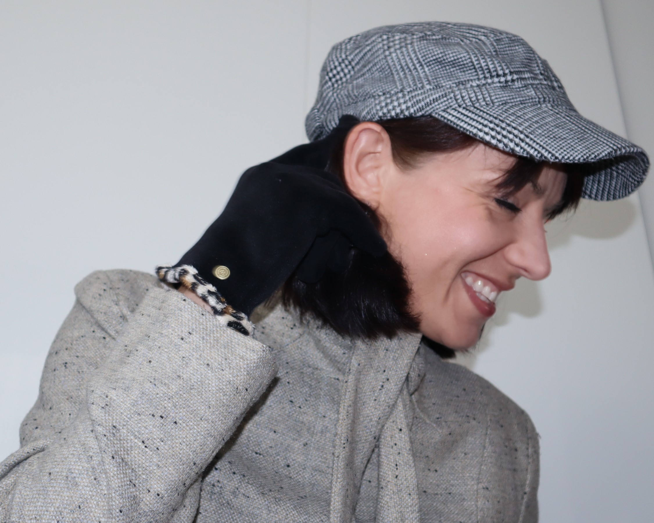 Czapka typu kaszkiet, z daszkiem. Wełniana, z regulacją szerokości. Biało-czarna kratka.