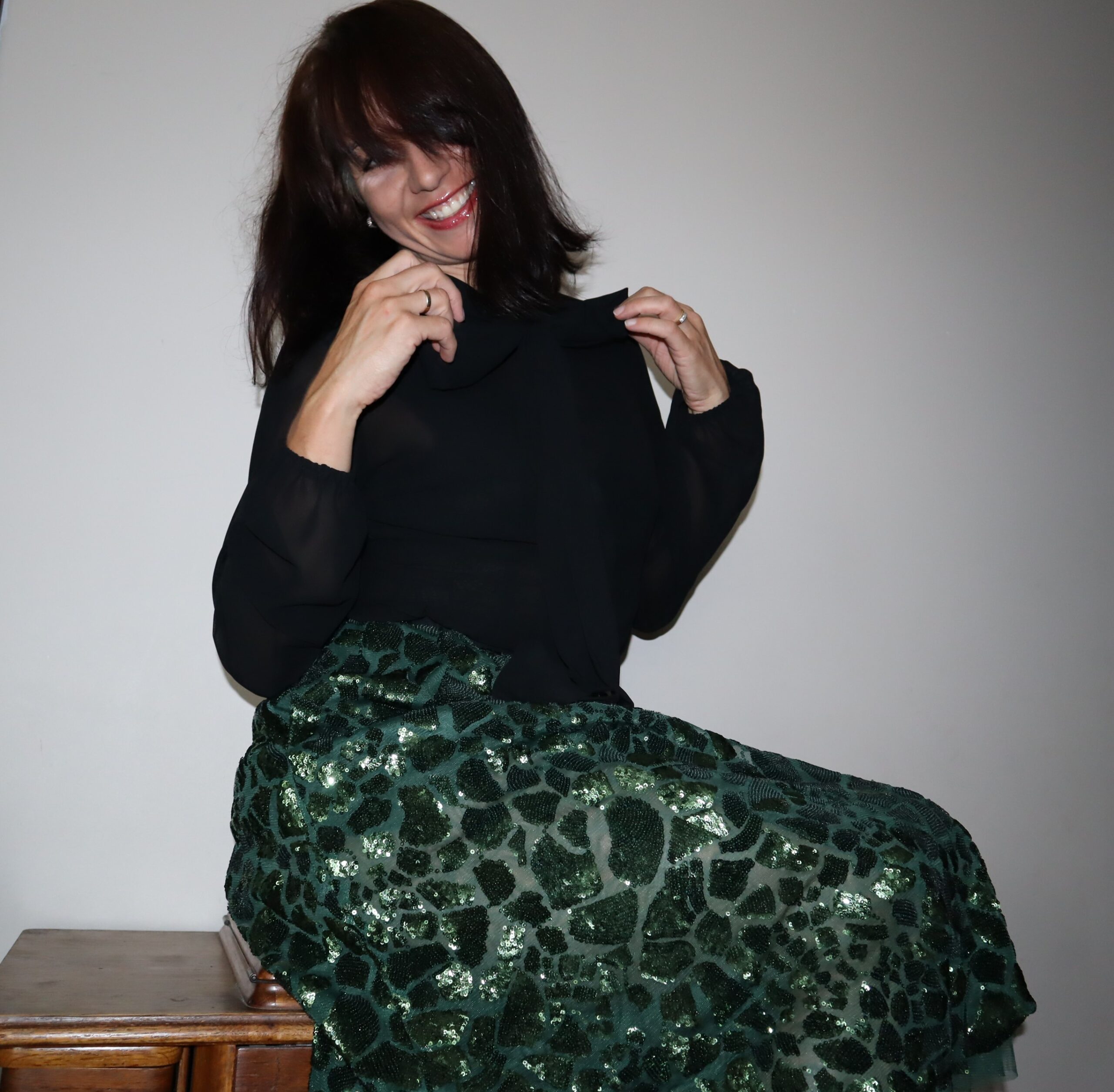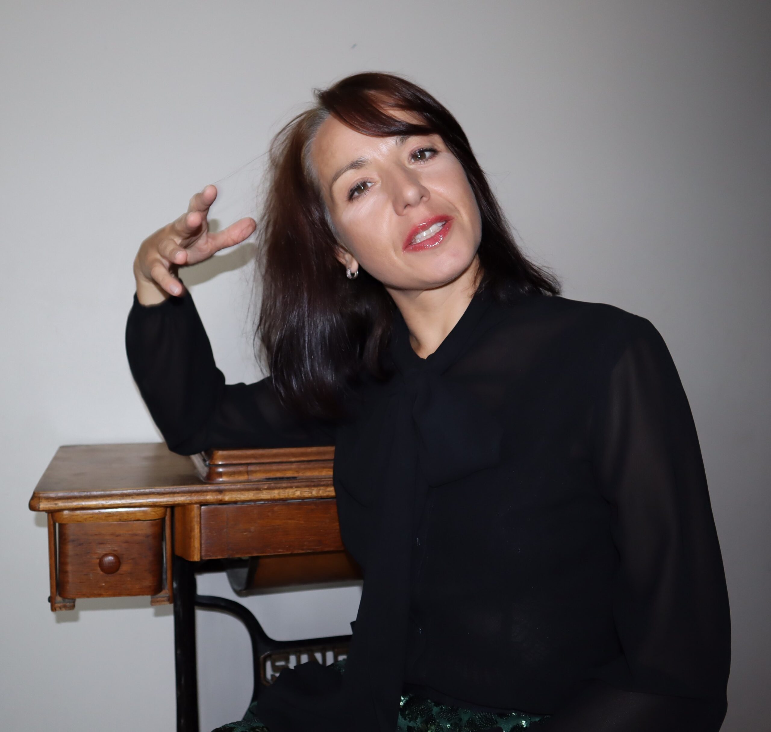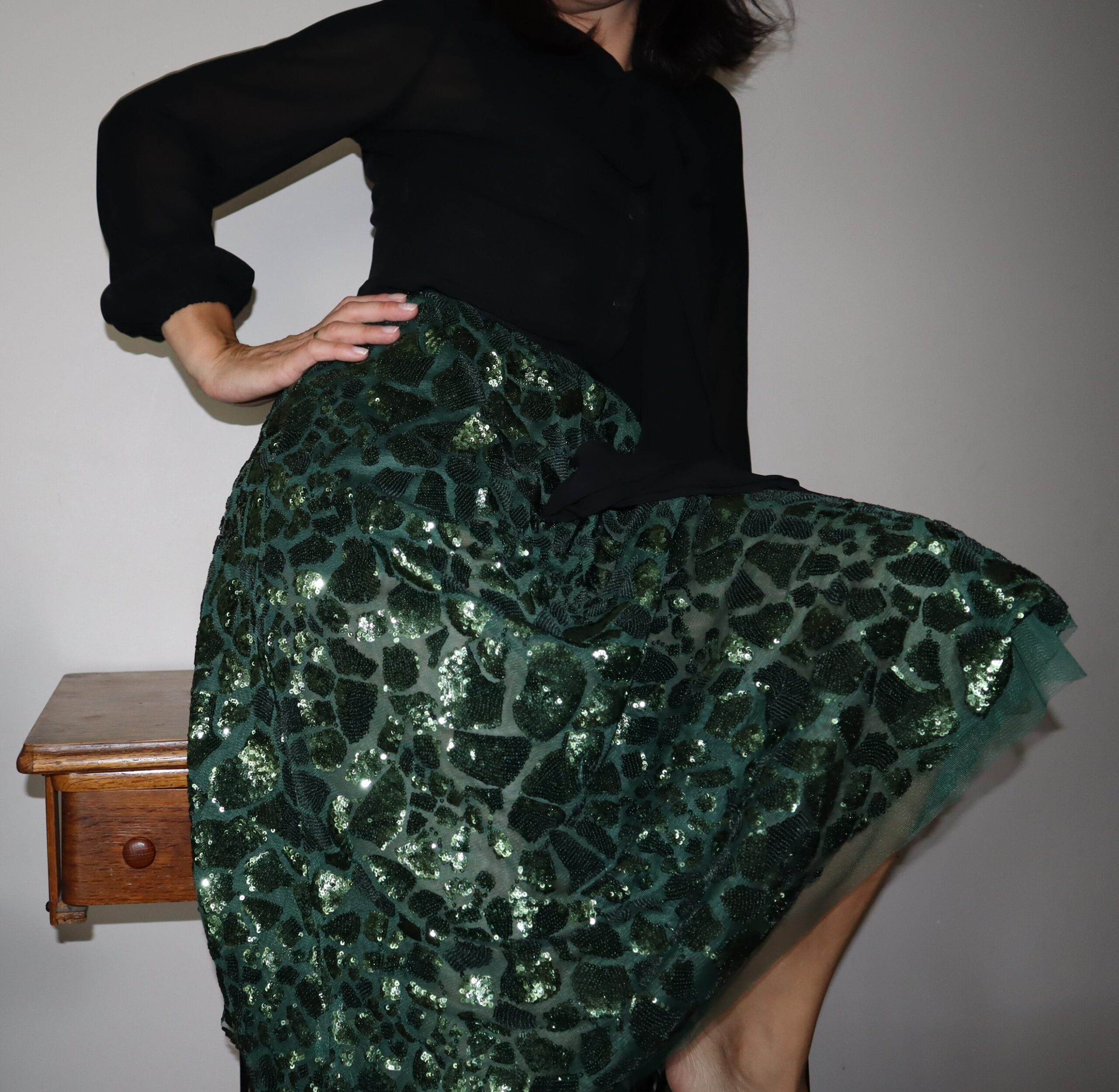 Czarna bluzka, zapinana na zatrzaski, z długą szarfą do wiązania pod szyją. Delikatnie prześwitująca, elegancka, ściągacze na rękawach.