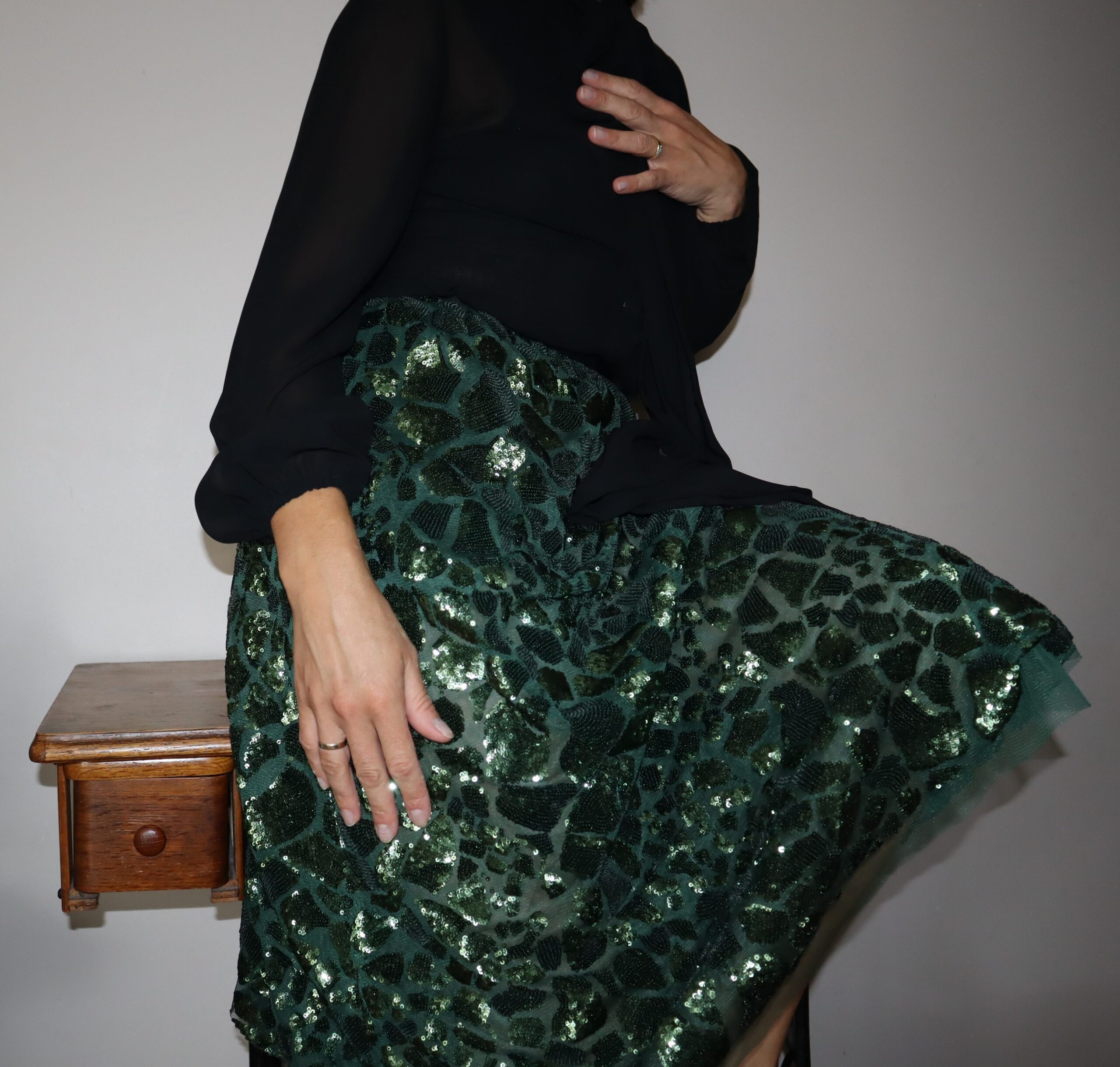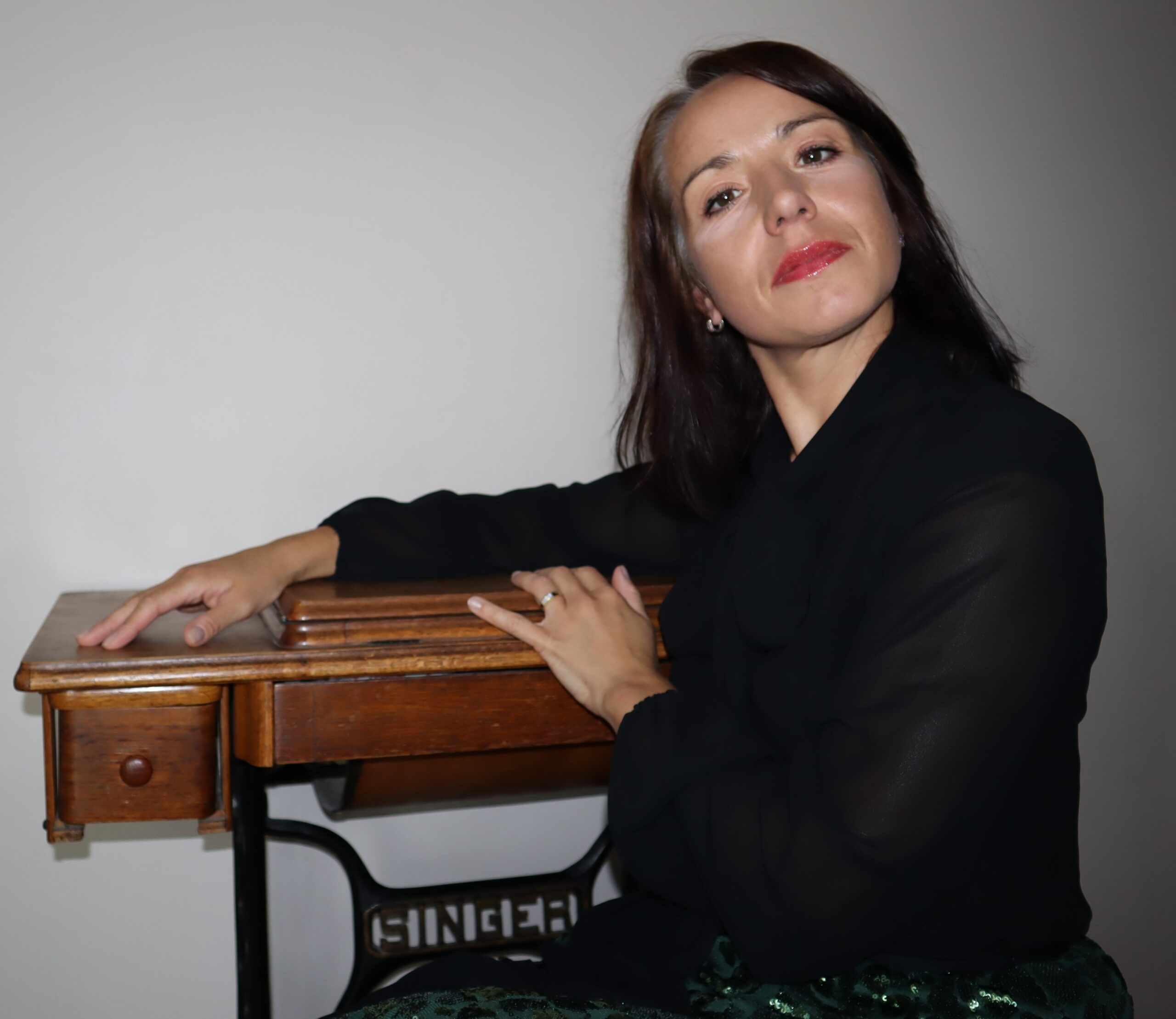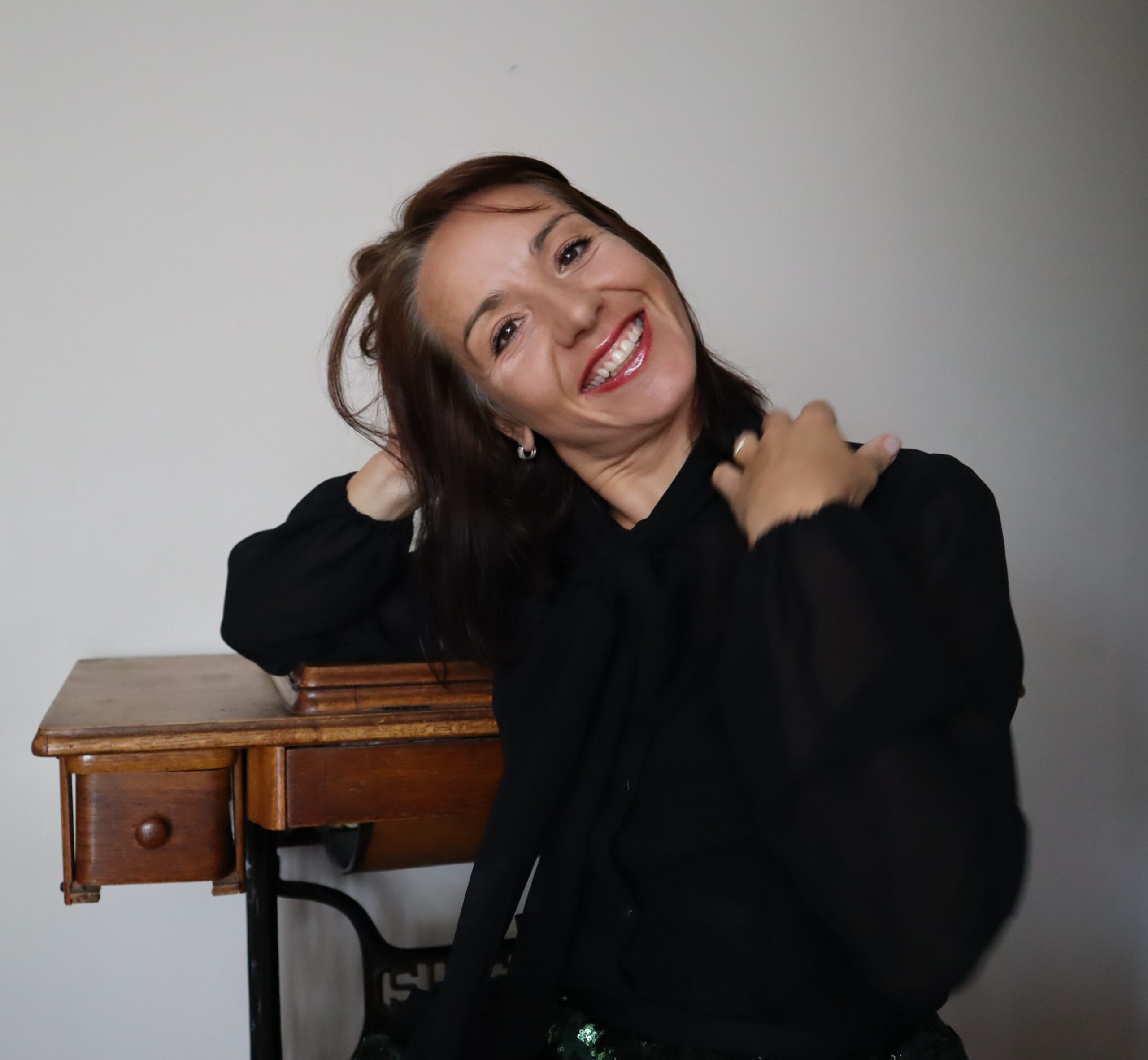 Czarna bluzka, zapinana na zatrzaski, z długą szarfą do wiązania pod szyją. Delikatnie prześwitująca, elegancka, ściągacze na rękawach.