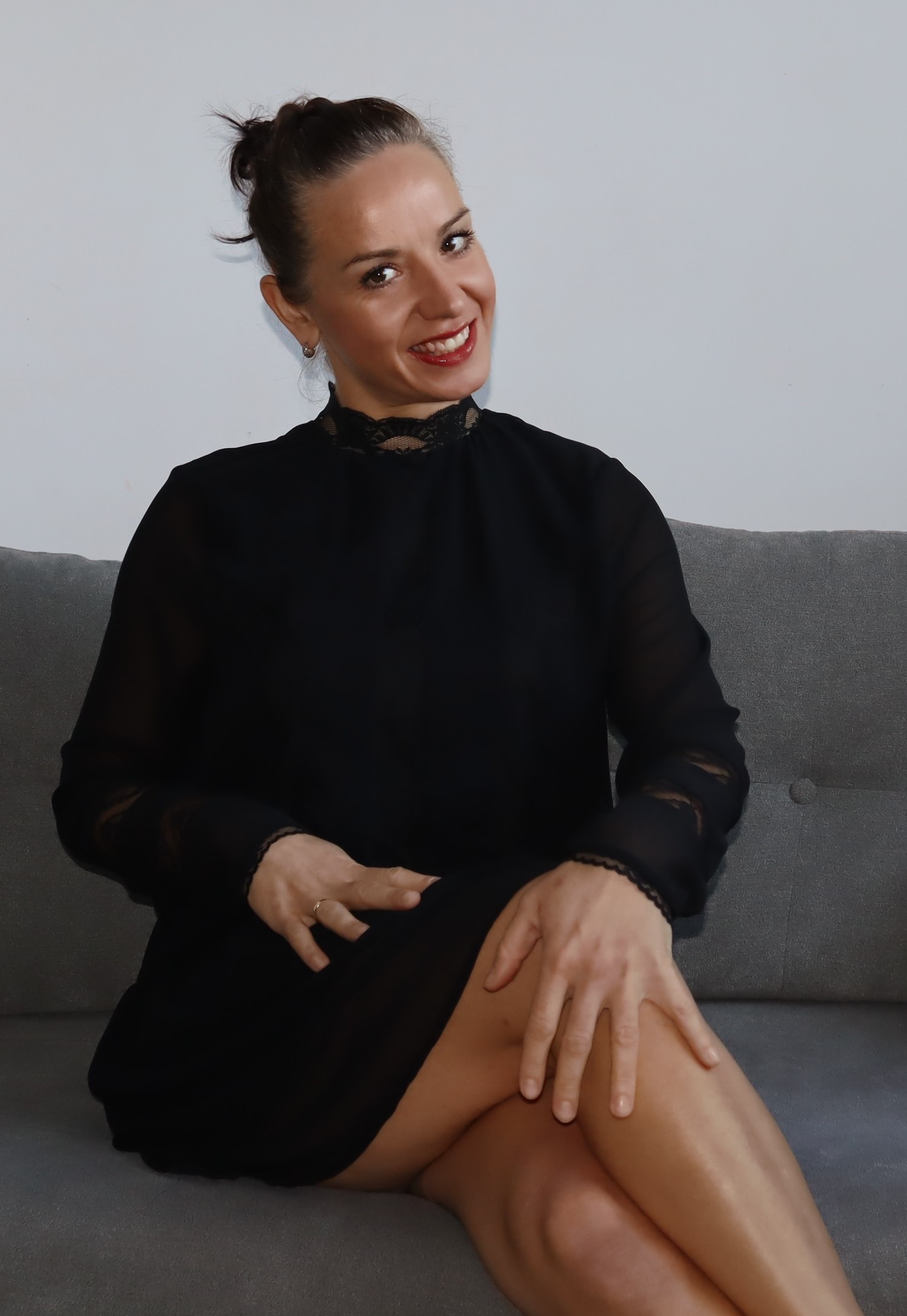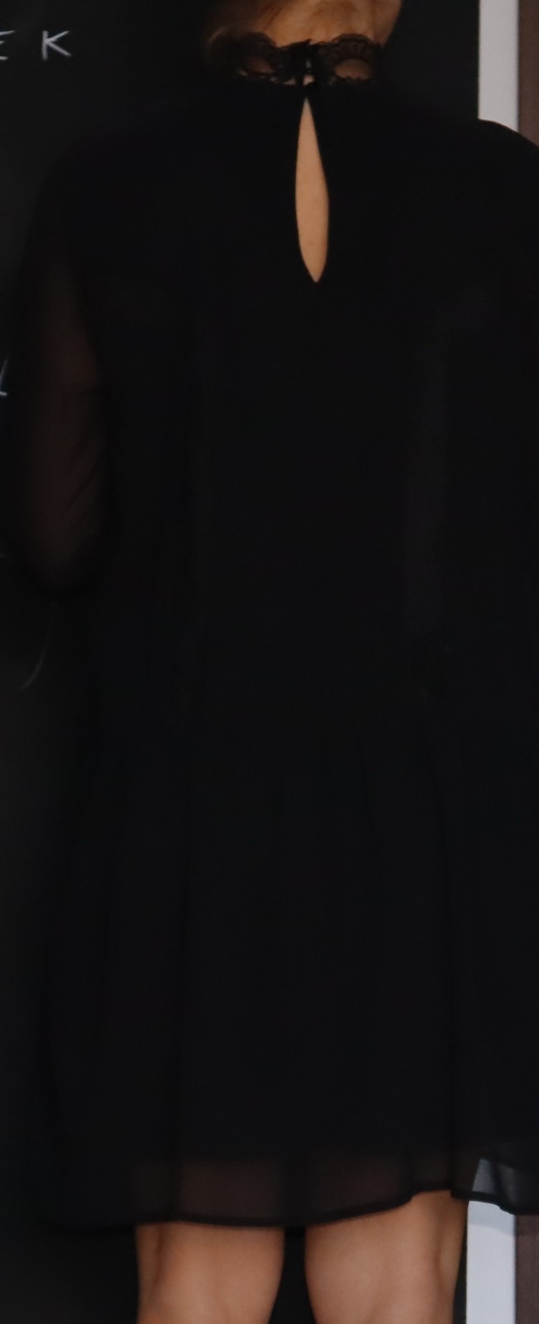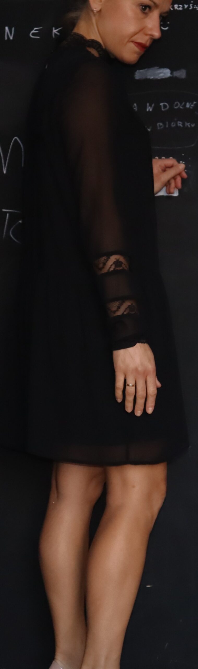 Czarna sukienka Villa, krój prosty. Z podszewką, delikatny materiał, wstawki koronki. Zapinana na szyi na trzy guziczki.