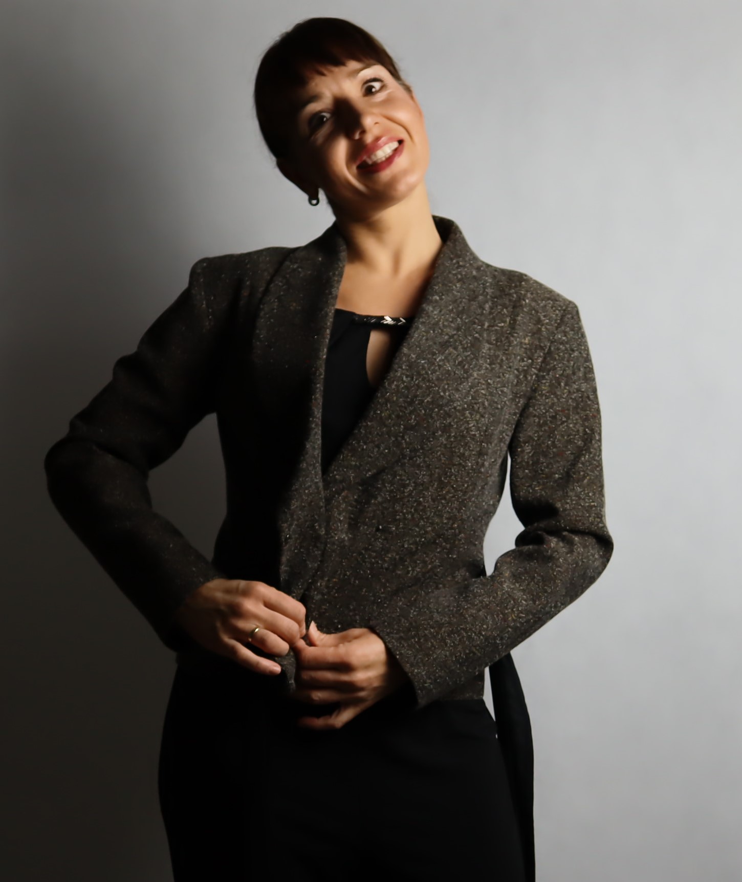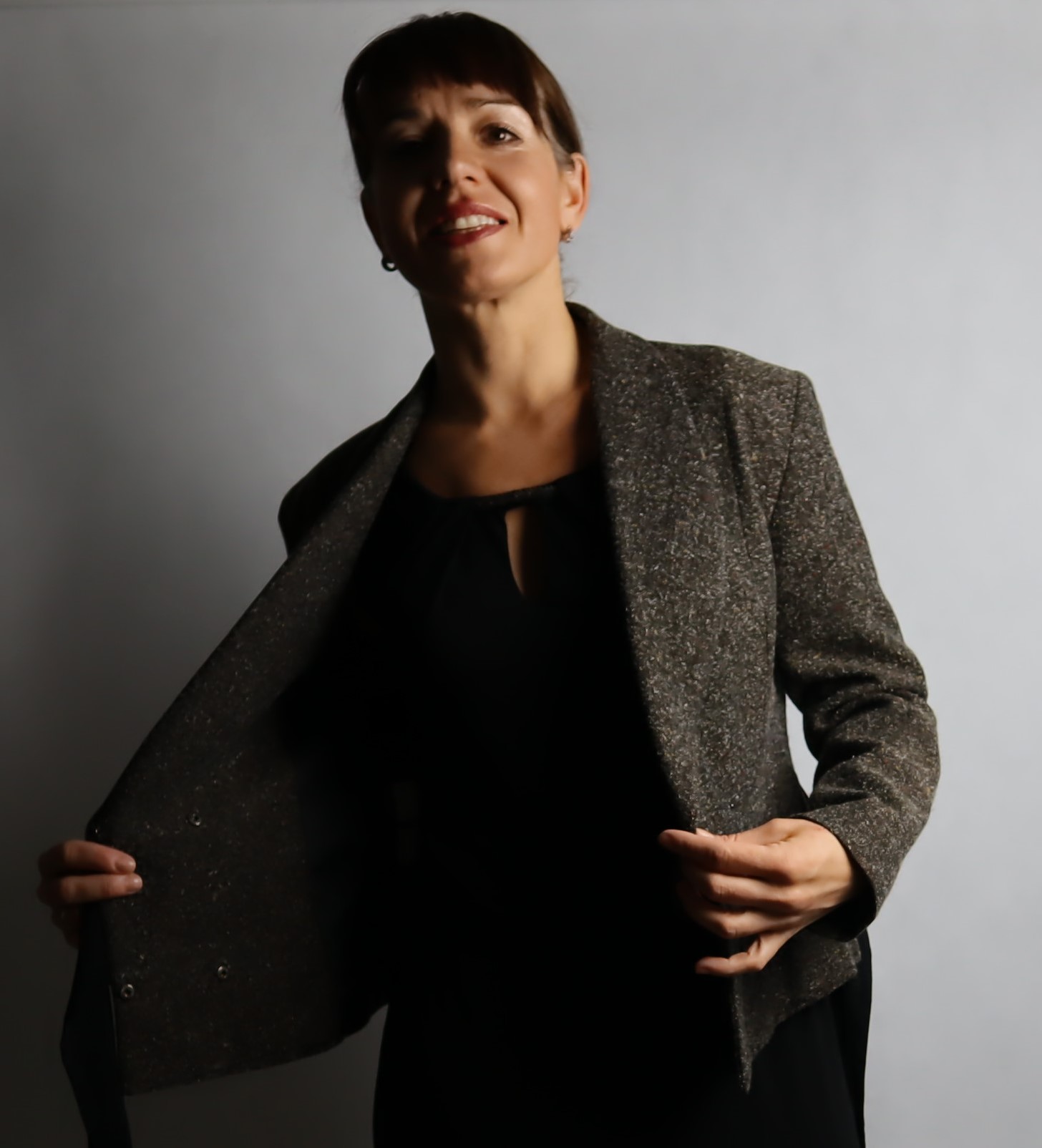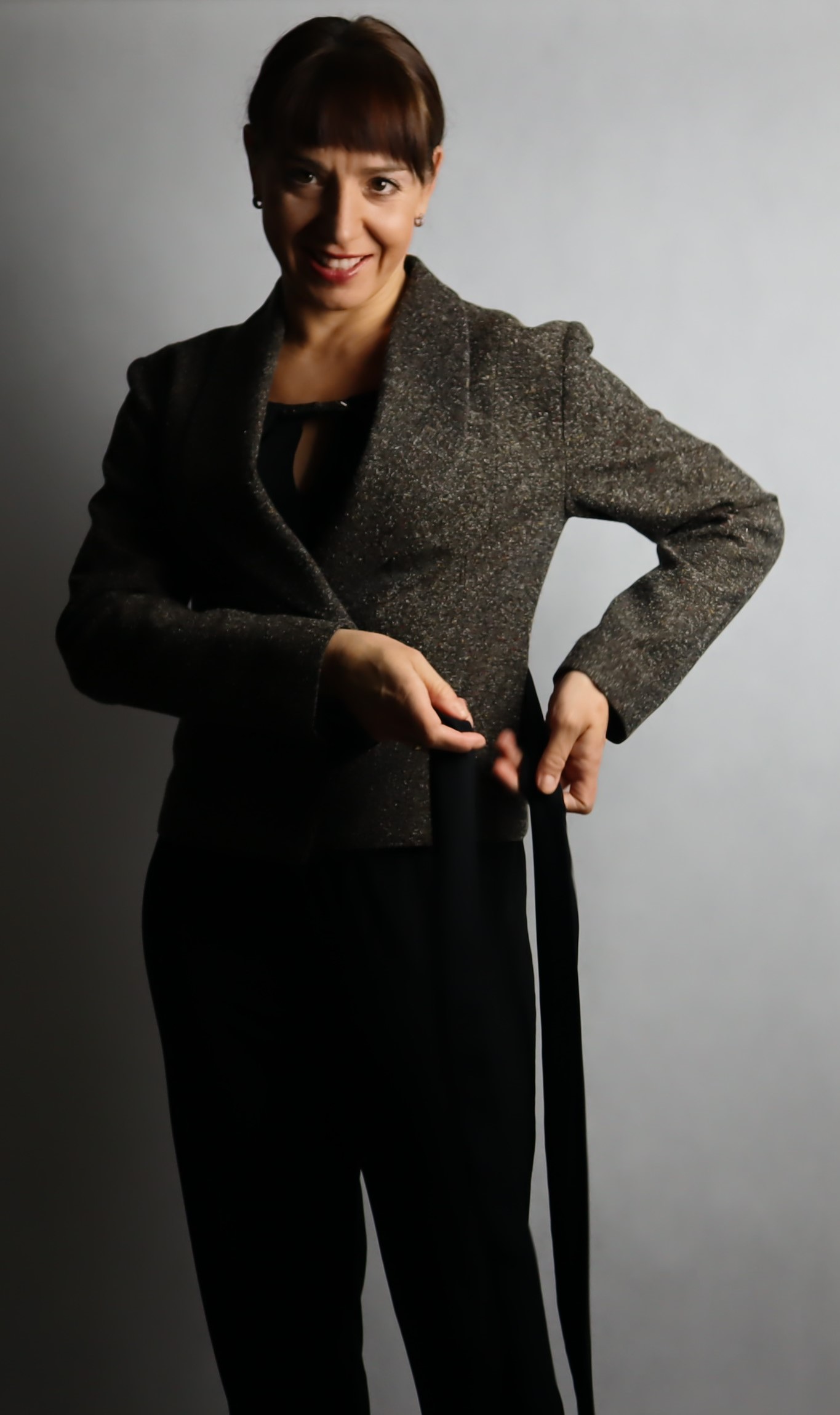 Brązowy, wełniany żakiet zapinany na cztery zatrzaski, z ozdobną czarną szarfą do zawiązywania w pasie.