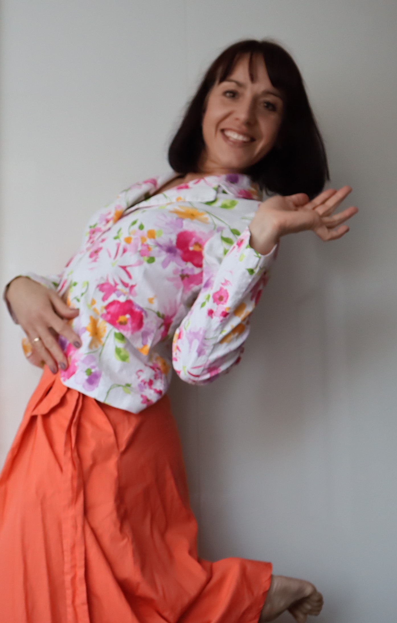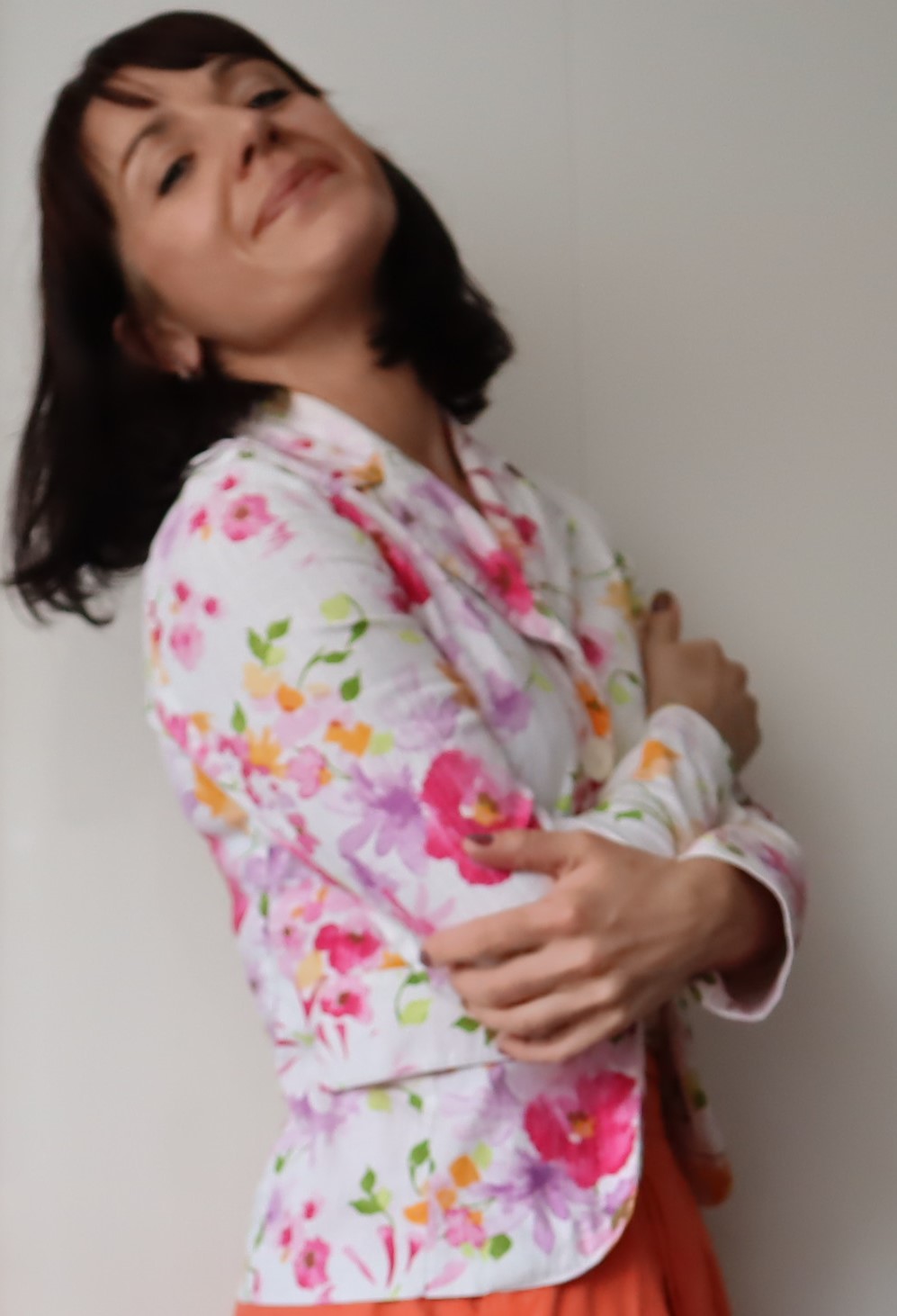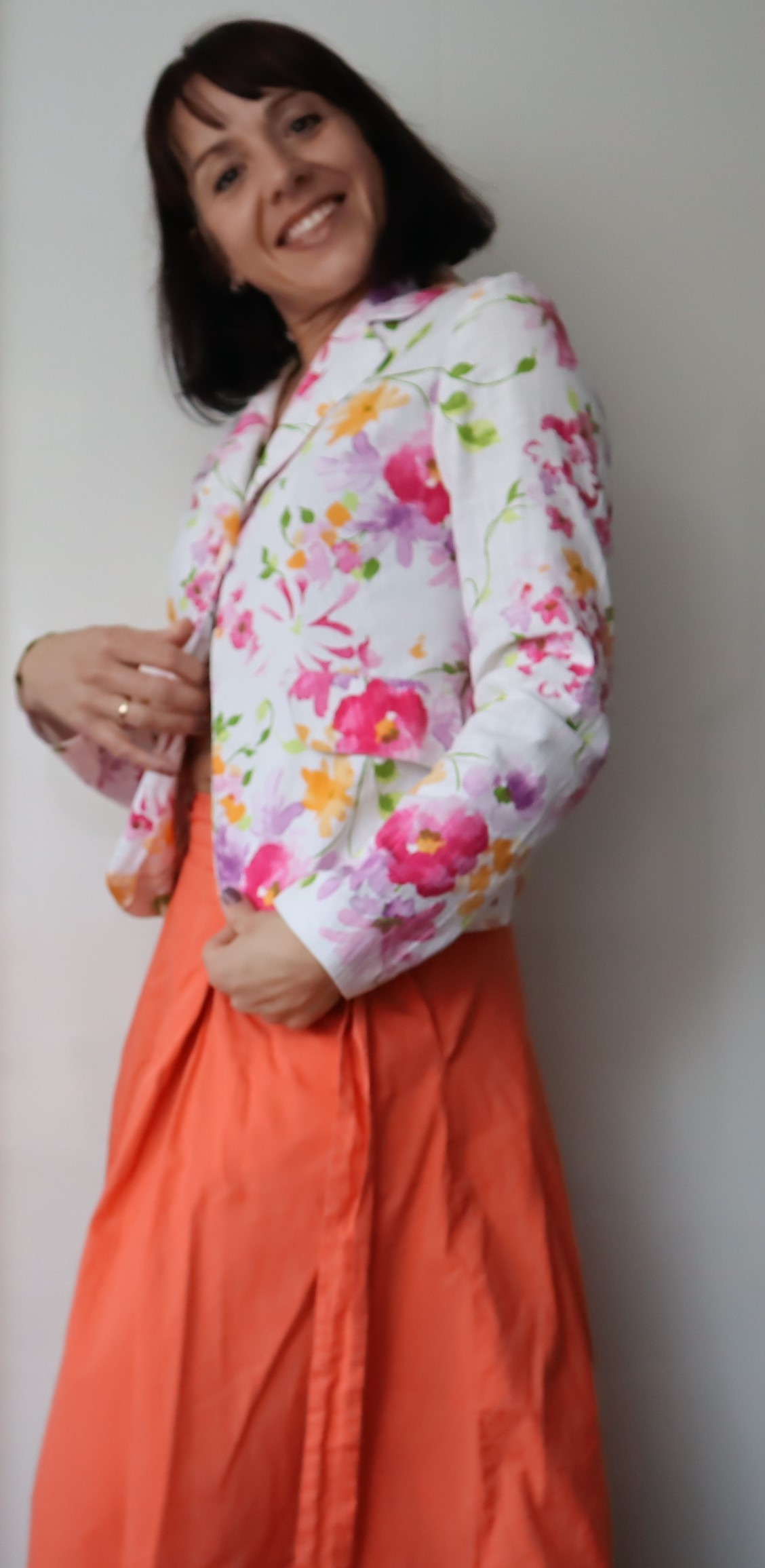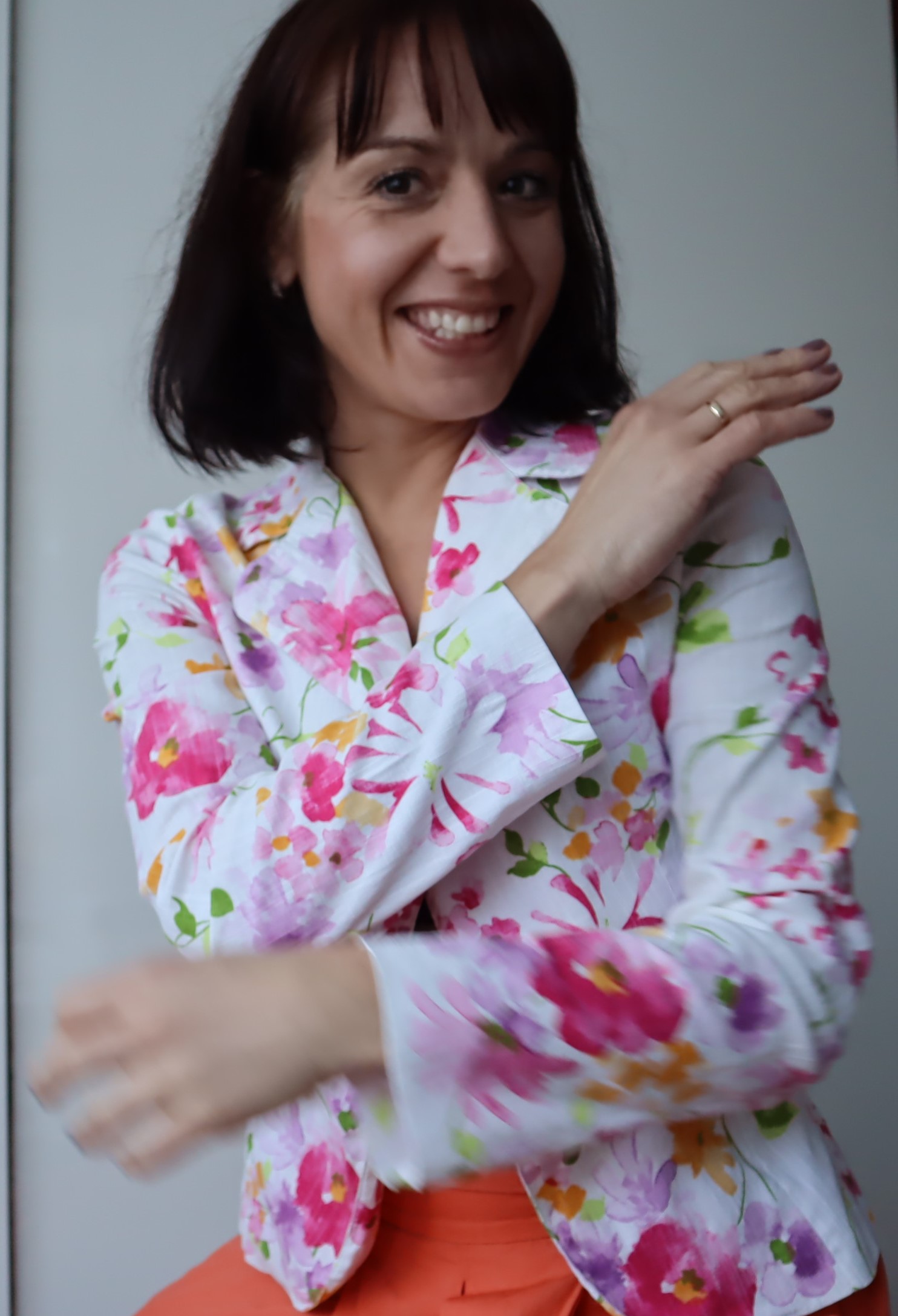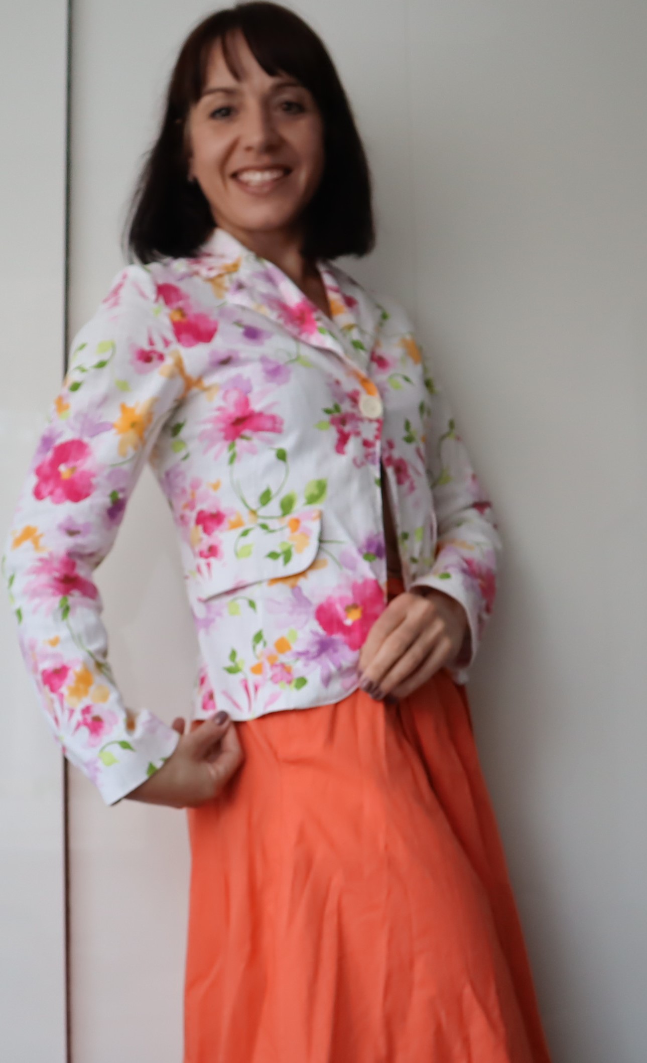 Żakiet letni Adres. Biały, wzór kwiatowy. Zapinany na guzik.
