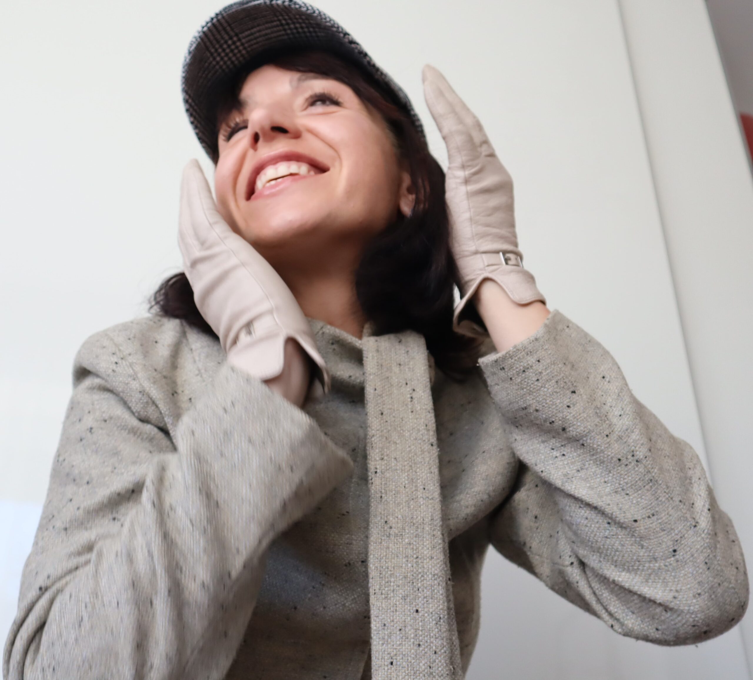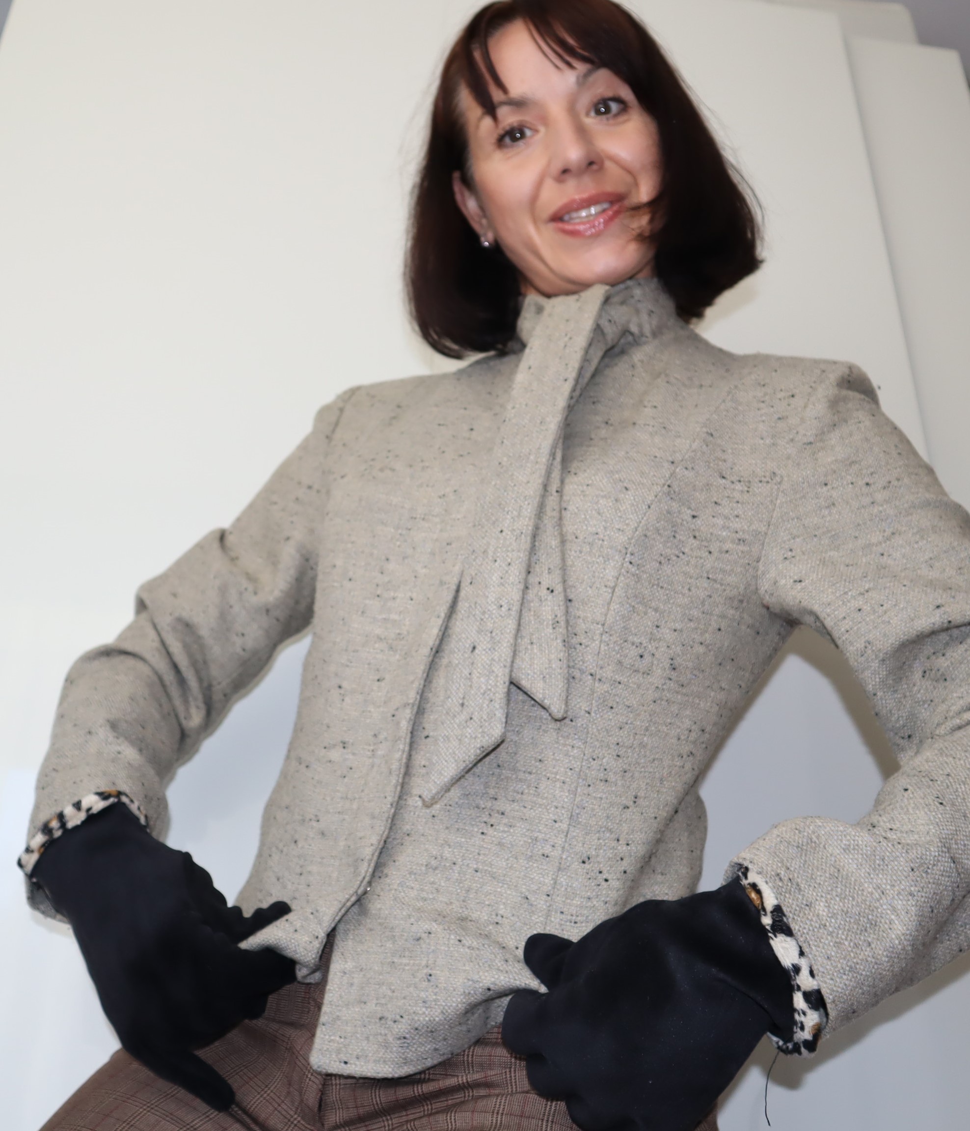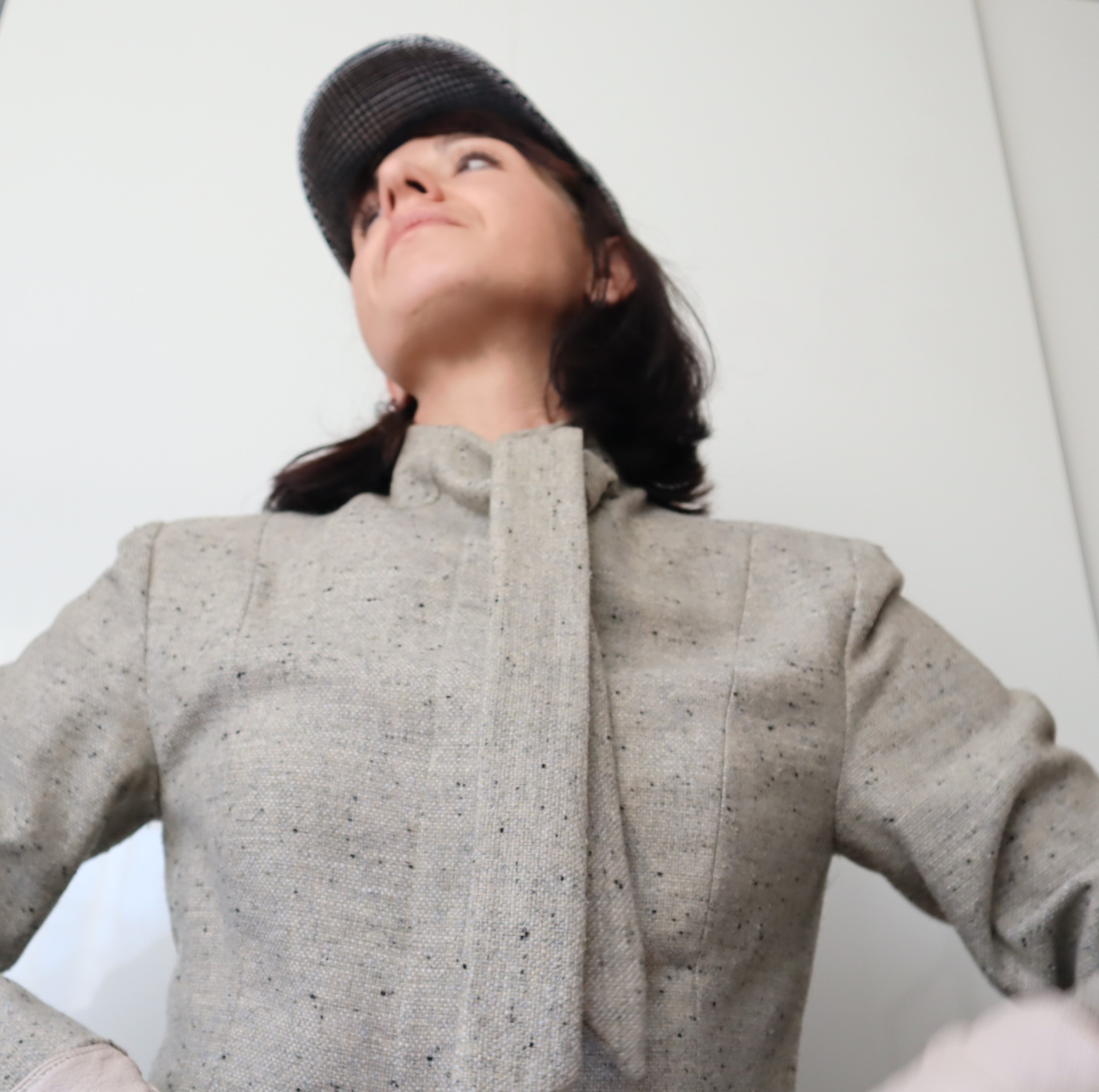 Beżowy, wełniany żakiet Femini. Zapinany na zatrzaski, na szyi ozdobne wiązanie.